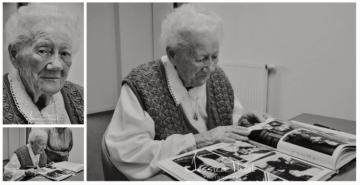 Mon arrière-grand mère [100 ans sur ces photos] regardant avec émotion l’album que j’avais créé pour elle.